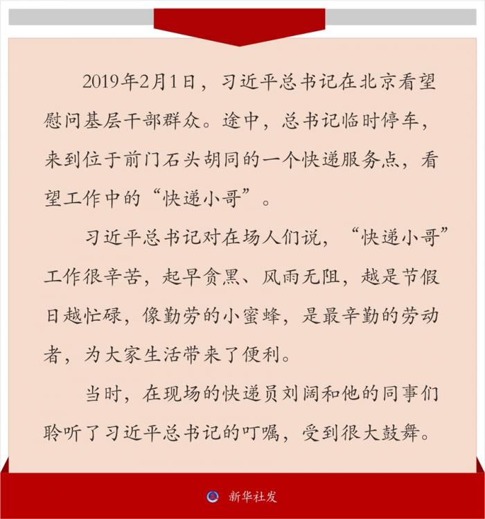 2019年2月1日,习近平总书记在北京看望慰问基层干部群众。途中,总书记临时停车,来到位于前门石头胡同的一个快递服务点,看望工作中的“快递小哥”。