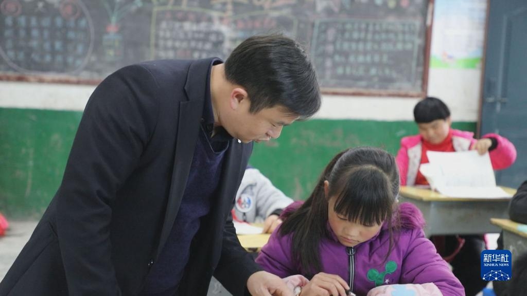 在湖南省常宁市塔山瑶族乡中心小学,盘玖仁在课堂上辅导学生(2021年11月25日摄)。新华社发(尹明摄)