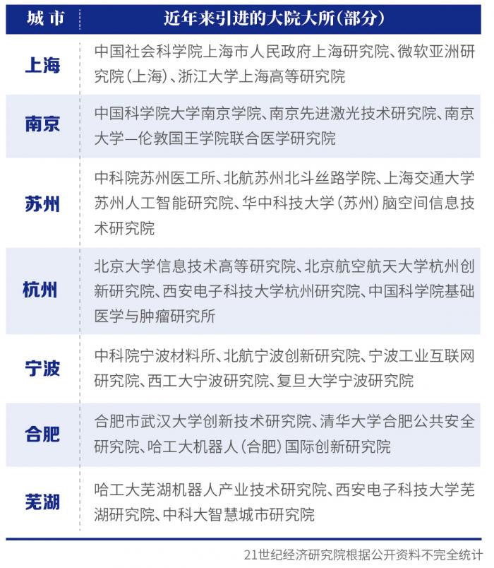 21世纪经济研究院梳理发现,近年来,上述城市引进国内外高校院所、科研机构动作频频,涉及人工智能、生物医药、航空航天、新能源与新材料等众多战略性新兴产业领域。值得一提的是,截至目前,苏杭甬三地已经累计引进各类高校院所、产业技术研究院超过250家。