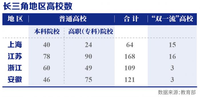 21世纪经济研究院梳理发现,长三角内包括苏州、无锡、南通、杭州、宁波等城市的高校资源,与自身经济实力形成了较为明显的反差。