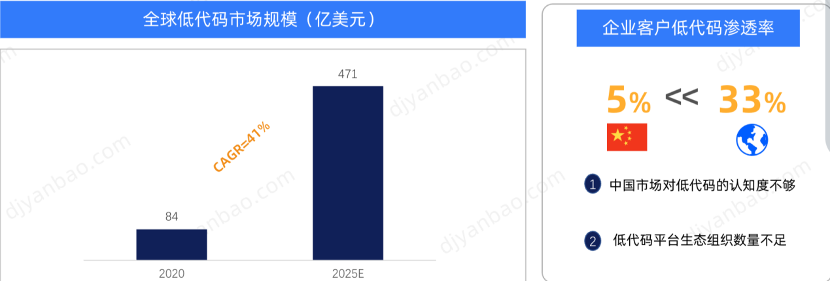 Gartner认为,未来企业间互动、需要更多的设备接入,业务会更加分散,专业开发者的数量并不足以满足企业IT需求。供需矛盾间,可视化+拖拉拽的低代码平台能让所谓的平民开发者,即普通的业务人员也能进行应用搭建,成为平台的最终用户,写更少的代码,花更少的钱,干更多的事,这看起来非常诱人,而且蕴含了巨大的商业前景。