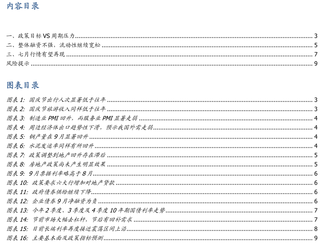 因而债市尚未到趋势性调整时,十月有望再现七月行情。当前基本面依然相对偏弱,政策虽在密集发力,但产生效果存在时滞,而且效果有待继续观察。同时,外部利率节后保持平稳。债市尚未到趋势性调整时。而节后市场再度进入加杠杆阶段,意味着配置力量再度加强,这将对长端债券形成利好。如果政策效果不及预期,十月有望复制七月行情。如果如此,那么考虑到6月10年国债利率高点是2.85%,8月降息之后如果上限下移10bps,那么目前上沿应该在2.75%左右,与目前水平相近。因而,不宜对债市过度悲观,利率尚未到趋势性调整时。10月或震荡下行。如果政策效果不及预期,那么市场有望复制七月的利率下行行情。