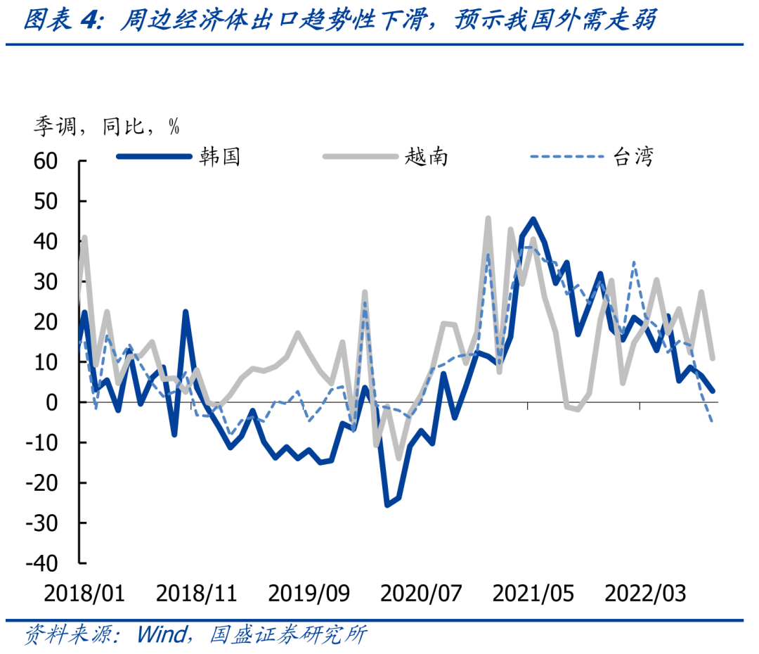 目前从生产面看,经济压力主要来自服务业,从需求面看,经济压力主要来自消费和出口。生产面来看,9月普遍有所改善,中采制造业PMI回升至50.1%,背后是基建需求回升带动水泥、钢铁、沥青等生产指标回升。其中,钢铁产量同比9月中旬同比增长7.7%。叠加去年的低基数因素,9月工业增加值将有较为显著的回升,我们预计增速将提升至5.5%左右。但服务业继续快速走弱,消费需求不足导致服务业PMI显著回落,9月较上月下滑3个百分点至48.9%。再度落入收缩区间。同时,全球经济放缓,贸易增速回落。9月周边经济体韩国、越南出口增速都有下滑,9月韩国出口同比增长2.8%,增速是2020年10月以来最低水平。而9月越南出口同比增速下滑16.5个百分点至10.9%,增速同样创去年10月以来最低水平。全球贸易增速放缓以及周边经济体出口增速回落,意味着我国出口增速将进一步回落。外需同样将成为经济下行压力。