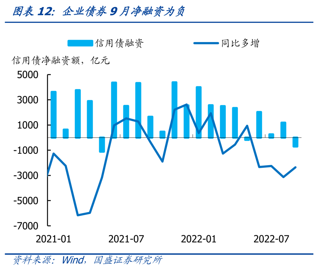 但政府债券与企业债券融资的减少意味着整体融资并不强,社融增速将继续下降。由于处于地方债空窗期,9月政府债券供给同比明显少增,7395亿元的净融资量同比减少4628亿元,而企业债券则在9月处于净偿还状态,这是5月以来再度净偿还,-707亿的净融资额同比少增2363亿元。政府债券和企业债券合计同比少增6991亿元,这决定了整体社融的同比少增状况,我们预计9月社融为2.45万亿,较去年同期2.9万亿依然少增。社融增速进一步下降,显示实体融资需求不足。