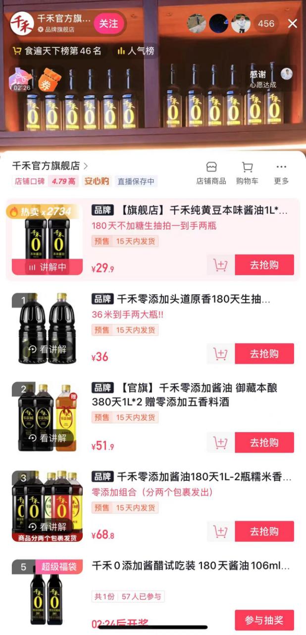 同一天,千禾官方直播间酱油等产品卖断货,主播称准备不足,正在加班加点生产。《21CBR》记者注意到,其官方抖音直播间中的在售商品,也处于“预售”状态。