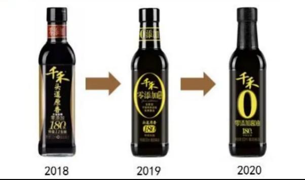 2018-2020年,千禾的零添加酱油换了两次次包装,对比前后不难发现,“0”愈发显眼。