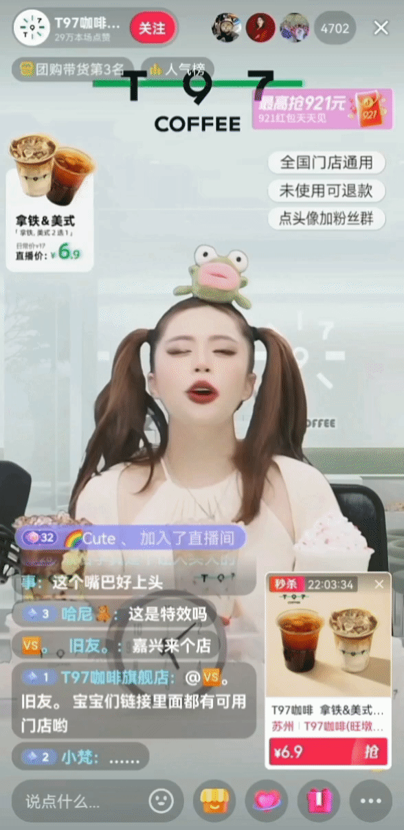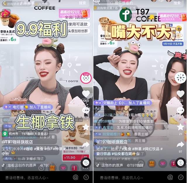 对很多人而言,T97咖啡还是一个相当小众的品牌,很多人甚至对它闻所未闻,但是,随着大嘴妹的出圈,直播间关于产品优惠券和核心产品的植入也在增加,很多人的关注焦点也从主播本人转移到产品本身,到目前为止,售价11.9元的97拿铁、售价12.9元的生椰拿铁都场均售出万份,光是这两个单品的销售额就超过几十万。