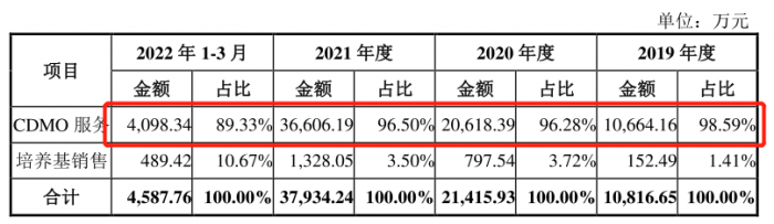 迈百瑞招股书显示,2019年、2020年、2021年迈百瑞CDMO服务收入金额分别为10664.16万元,20618.39万元,36606.19万元分别占公司主营业务收入的98.59%、96.28%、96.50%。