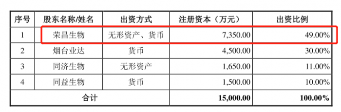 2013年6月10日,同济生物、同益生物、荣昌生物和烟台业达签署《烟台迈百瑞国际生物医药有限公司章程》,约定共同出资设立迈百瑞,注册资本15000万元,其中荣昌生物出资7350万元,出资方式为货币、无形资产,占注册资本的49%,为第一大股东。
