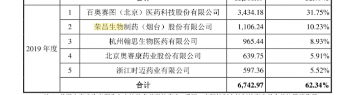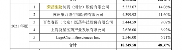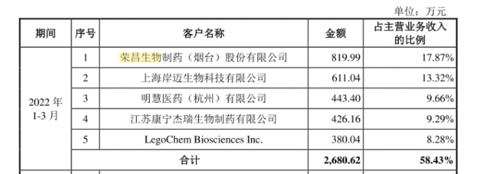 根据招股书数据,2021年及2022年一季度,迈百瑞第一大客户均是荣昌生物,对其实现的销售收入分别为5333.07万元、819.99万元,销售收入占比分别为14.06%、17.87%。此外2019年,荣昌生物为迈百瑞第二大客户,对其实现销售收入1106.24万元。