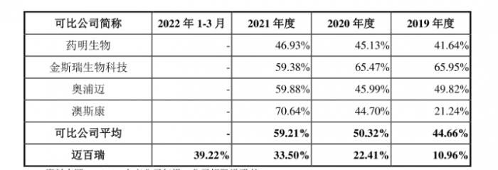报告期内,迈百瑞主营业务毛利率分别为10.96% 、22.41% 、33.50%及39.22%,主营业务毛利率波动较大且持续提升。但与同行相比,迈百瑞主营业务毛利率远低于同行业可比公司。招股书中指出,这主要是产品或服务类型、收入结构占比等因素导致。