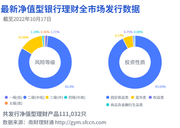 南财金融终端、南财理财通数据显示,截至2022年10月17日,全市场共发行净值型理财产品111,032只。其中,一级(低风险)产品占比1.71%,二级(中低风险)产品占比82.4%,三级(中风险)产品占比14.36%,四级(中高风险)产品占比1.18%,五级(高风险)产品占比0.36%。