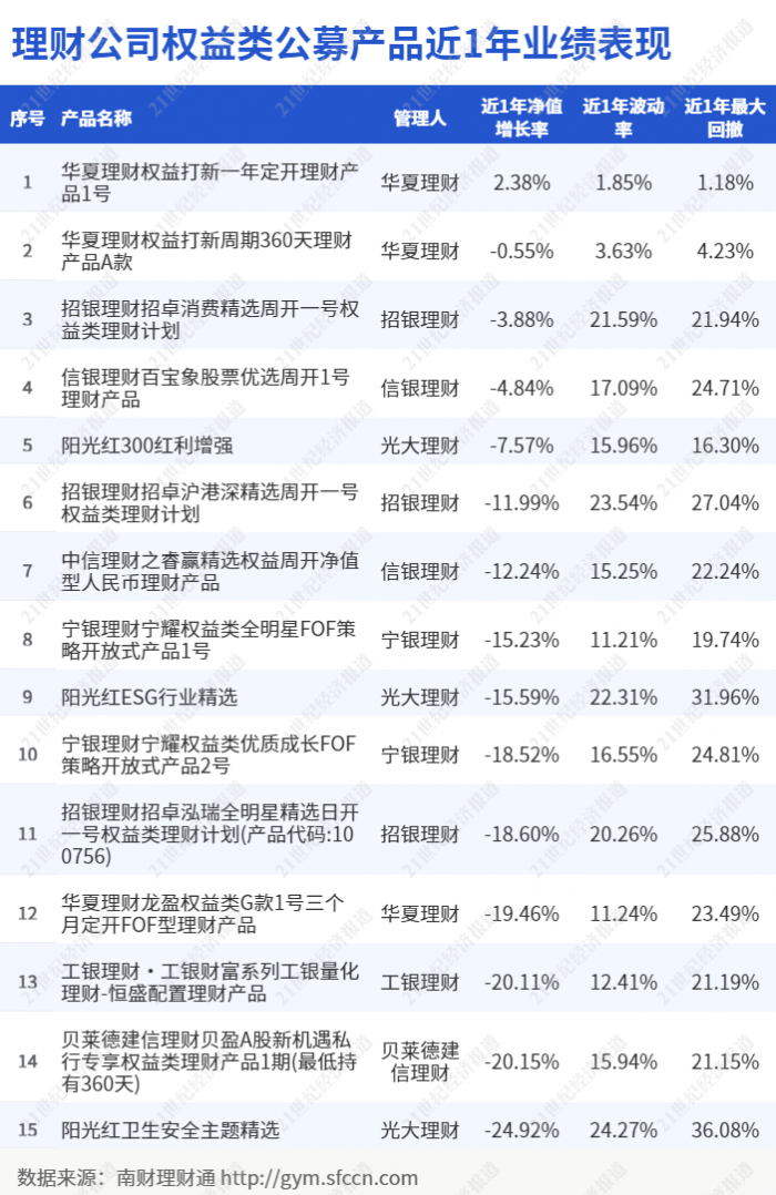 从权益类公募产品近1年业绩表现看,除华夏理财的“权益打新一年定开1号”小幅收涨外,其余产品均录得负收益。