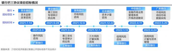 21世纪经济报道记者根据招标网站公开信息,不完全统计了各大银行巴三协议相关的项目招标信息发现,2021年以来各家银行的咨询项目招标集中于资本计量、操作风险、市场风险计量、信用风险计量、第三支柱专项审计等方面。