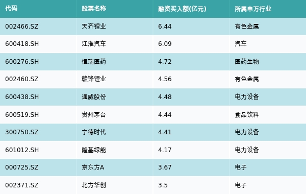 10月17日,两市共有2452只个股有融资资金买入,其中天齐锂业、江淮汽车、恒瑞医药排名前三,买入金额分别6.44亿元、6.09亿元、4.72亿元。融资买入额前10个股详情见下表: