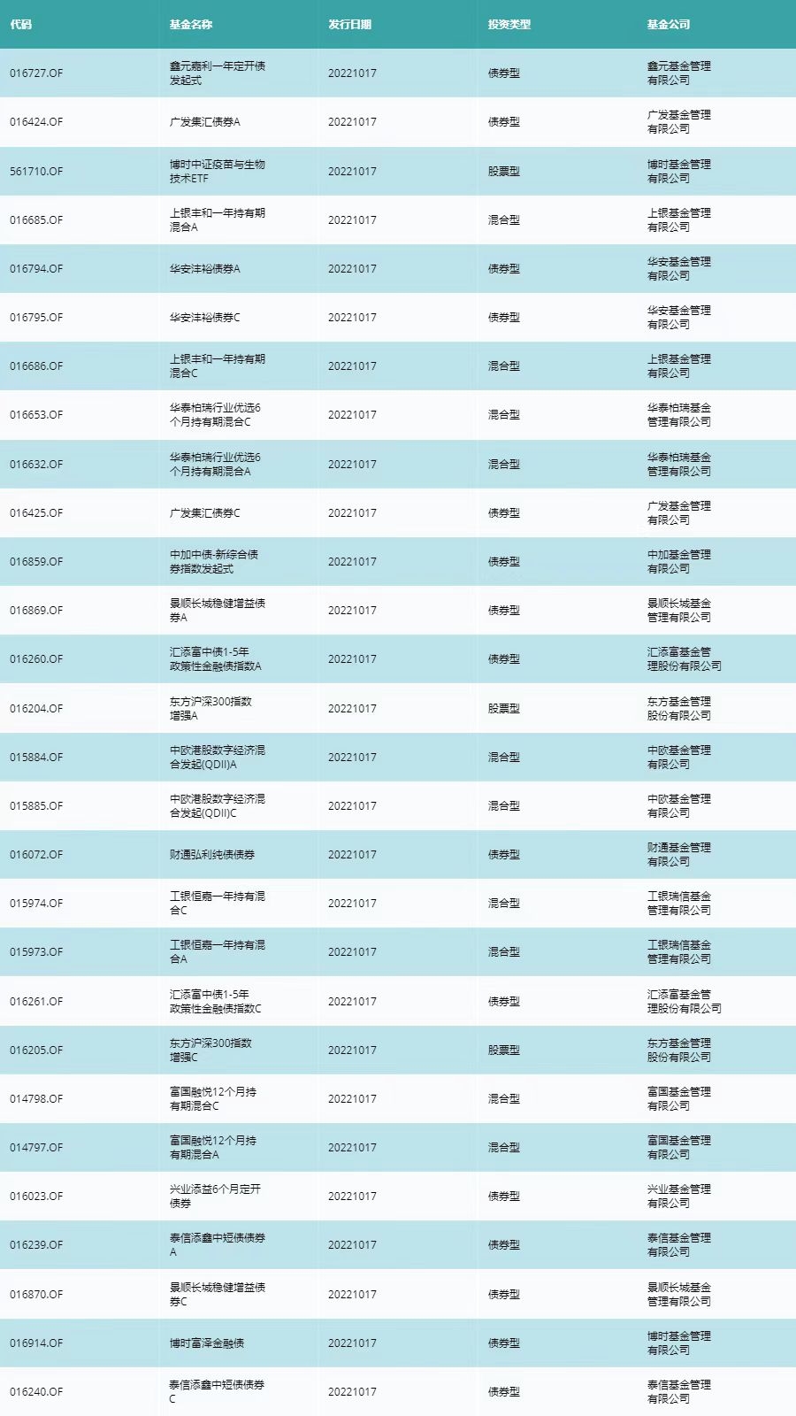 10月17日,有28只新基金发行,分别为:鑫元嘉利一年定开债发起式、广发集汇债券A、博时中证疫苗与生物技术ETF、上银丰和一年持有期混合A、华安沣裕债券A、华安沣裕债券C、上银丰和一年持有期混合C、华泰柏瑞行业优选6个月持有期混合C、华泰柏瑞行业优选6个月持有期混合A、广发集汇债券C、中加中债-新综合债券指数发起式、景顺长城稳健增益债券A、汇添富中债1-5年政策性金融债指数A、东方沪深300指数增强A、中欧港股数字经济混合发起(QDII)A、中欧港股数字经济混合发起(QDII)C、财通弘利纯债债券、工银恒嘉一年持有混合C、工银恒嘉一年持有混合A、汇添富中债1-5年政策性金融债指数C、东方沪深300指数增强C、富国融悦12个月持有期混合C、富国融悦12个月持有期混合A、兴业添益6个月定开债券、泰信添鑫中短债债券A、景顺长城稳健增益债券C、博时富泽金融债、泰信添鑫中短债债券C,详情见下表: