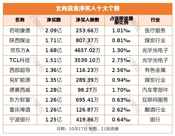 个股方面,北向资金净买入药明康德(603259.SH)、陕西煤业(601225.SH)、京东方A(000725.SZ)、TCL科技(000100.SZ)、西部超导(688122.SH)居前,其中,药明康德被净买入2.09亿元,陕西煤业被净买入1.71亿元,京东方A被净买入1.68亿元,TCL科技被净买入1.51亿元,西部超导被净买入1.36亿元。