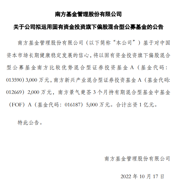南方基金也于今日发布公告称,将以固有资金投资旗下三只偏股混合型公募基金,合计出资1亿元。