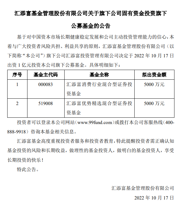 本着与广大投资者风险共担、利益共享的原则,汇添富基金于今日发布公告称,旗下公司汇添富投资管理有限公司决定于2022年10月17日出资1亿元投资本公司旗下两只公募基金。