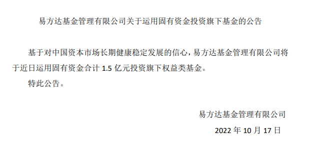 根据易方达基金发布的公告,基于对中国资本市场长期健康稳定发展的信心,易方达基金管理有限公司将于近日运用固有资金合计1.5亿元投资旗下权益类基金。