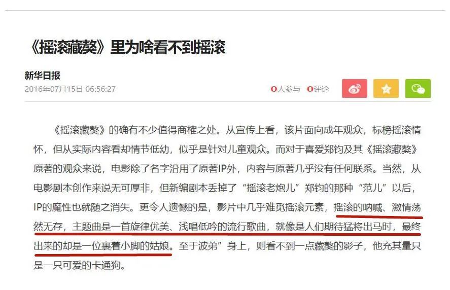 例如,郑钧的摇滚题材动画《摇滚藏獒》、大鹏的《缝纫机乐队》,音乐本身的表现力不够成为观众给出差评的主要原因。就像当年新华日报给《摇滚藏獒》的评价,“摇滚的呐喊、激情荡然无存,主题曲是一首流行歌曲,就像期待猛将出马,最终出来的确实一个裹着小脚的姑娘。”而《缝纫机乐队》无论是各类乐手的客串参演,还是片末合奏的《不再犹豫》,都是在用情怀来填补音乐上的不足。