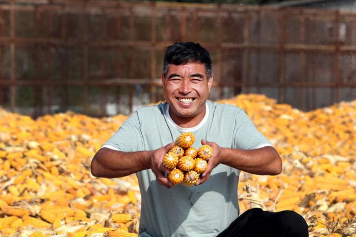 9月22日,在河南焦作博爱县磨头镇崔庄村,“70后”崔卫民展示今年丰收的玉米。新华社发(程全摄)