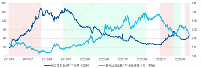创业板指数作为高弹性、高波动的品种,投资者通常倾向于采用创业板ETF进行波段操作,交易属性较强。2018年至今,ETF份额与净值走势呈显著的负相关效应,投资者偏好在净值下跌时入场,净值上升过程减仓,体现出明显左侧交易、逆向交易的特征。