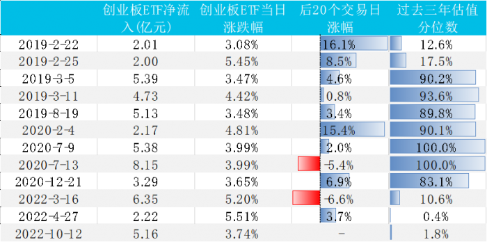时间来到10月12日,创业板ETF大幅上涨3.74%,同时资金净流入5.16亿元,呈现“历史罕见”的顺势流入特征。据统计,2019年以来日涨幅超过3%且资金流入大于2亿元共计发生11次,此后20个交易日平均涨跌幅为4.5%,且其中有9次均为正收益。