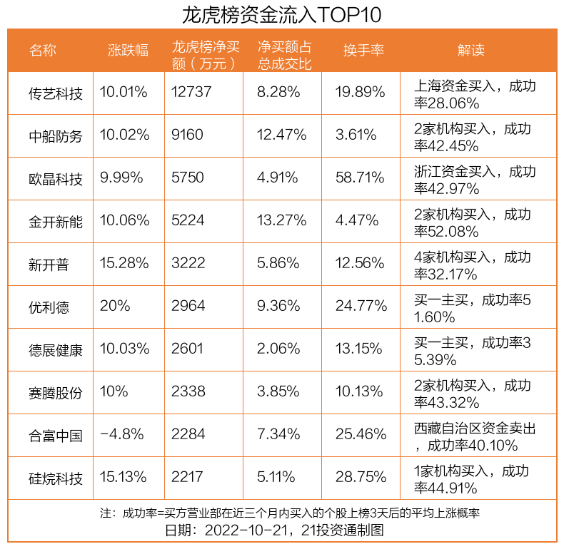 10月21日,上证指数上涨0.13%,深证成指下跌0.42%,创业板指下跌0.27%。盘后龙虎榜数据显示,共有43只个股因当日异动登上龙虎榜,资金净流入最多的是传艺科技(002866.SZ),达1.27亿元。