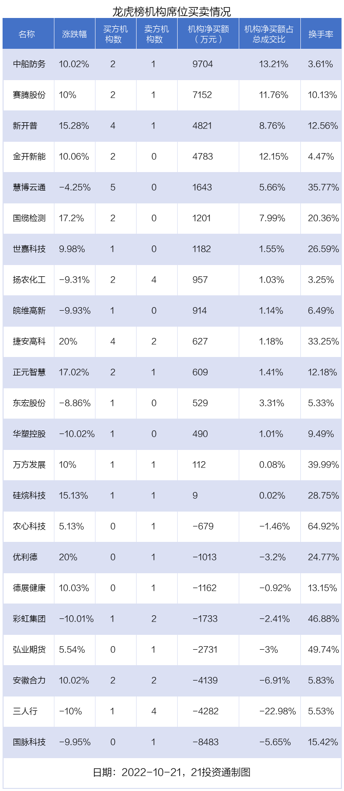 10月21日,23只个股龙虎榜出现了机构的身影,机构合计净买入1.05亿元。具体来看,机构净买入15股,净卖出8股。