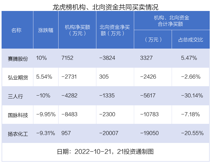 值得注意的是,机构和北向资金共同净卖出了三人行、国脉科技2股;在弘业期货、赛腾股份、扬农化工上出现分歧。