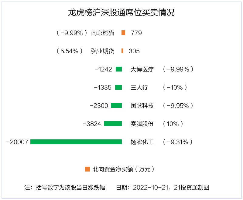 10月21日,北向资金参与龙虎榜中的个股共有7只,合计净卖出2.76亿元。其中沪股通净买入1股,净卖出3股,合计净卖出2.44亿元;深股通净买入1股,净卖出2股,合计净卖出3237.49万元。