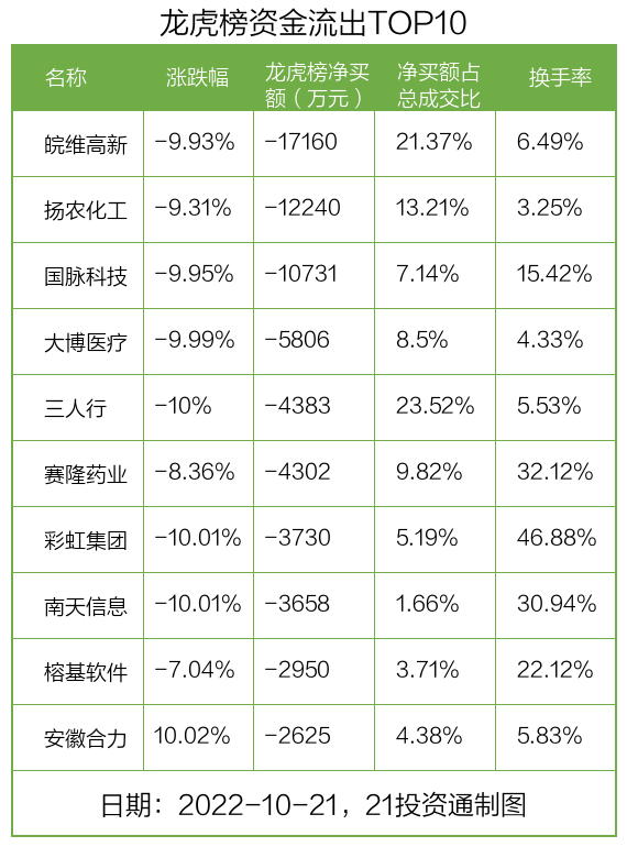 而龙虎榜中资金净流出最多的是皖维高新(600063.SH),被净卖出为1.72亿元,占总成交金额的21.37%。皖维高新收盘下跌9.93%,换手率为6.49%。