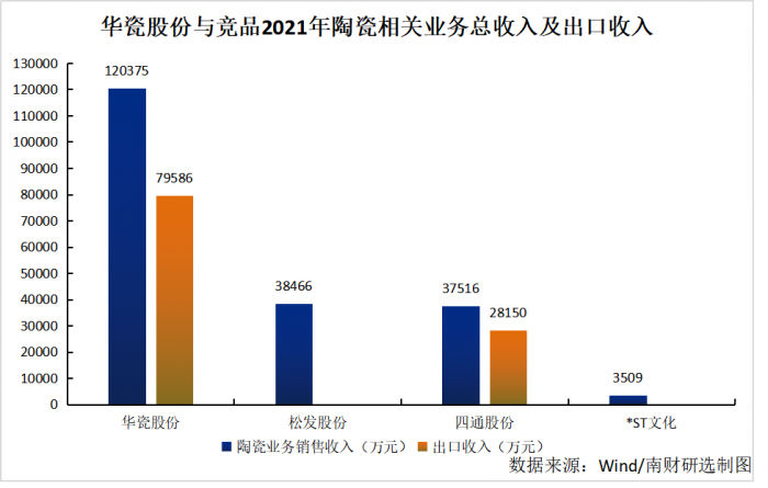 据各上市公司2021年年报数据,从陶瓷业务营收来看,华瓷股份陶瓷业务营收及出口收入分别达到12.07亿元和7.96亿元,均远超同行其他三家公司(松发股份、*ST文化两家公司2021年年报均未单独披露陶瓷业务的出口收入)。