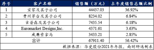 公司主要客户包括宜家、贵州茅台、威廉索拿马、沃尔玛、吉普森、布鲁斯特等行业内全球知名企业。公司与这些优质客户均保持了良好的长期合作关系。其中宜家及其子公司为公司的第一大客户,2021年销售额达到4.44亿元,占年度销售总额的36.92%。贵州茅台及其子公司为公司的第二大客户。孙公司贵州红官窑被贵州茅台评为“2021年度优秀供应合作伙伴”。
