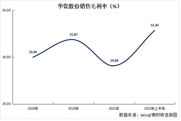 从毛利率来看,华瓷股份2019年、2020年、2021年及2022年上半年销售毛利率保持相对稳定,均在30%左右。