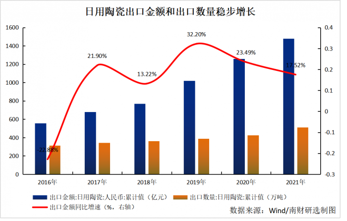 根据国家统计局数据显示,我国日用陶瓷品的出口金额和出口数量,分别由2016年的558亿元、314万吨,增加到2021年的1478亿元、511万吨,逐年稳步增长。