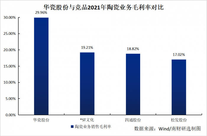 而从销售毛利率来看,华瓷股份的2021年销售毛利率为29.96%,而同行三家公司陶瓷业务毛利率均未超过20%,显示出华瓷股份的陶瓷产品相对竞品具有一定的竞争优势。