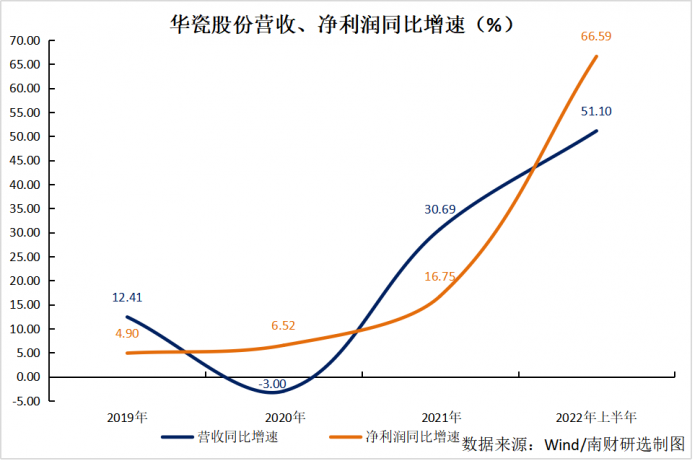 从净利润增速来看,华瓷股份近年来净利润呈现加速增长,2022年上半年同比增速高达66.60%,与营业总收入同比增速(51.10%)保持同步。