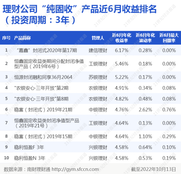 本期纯固收榜单国有行理财公司收益较为突出,建信理财“‘嘉鑫’封闭式2020年第17期”、工银理财“恒鑫固定收益类期间分配封闭净值型产品(2019年6号)”近6个月年化收益率分别为6.17%、5.46%...