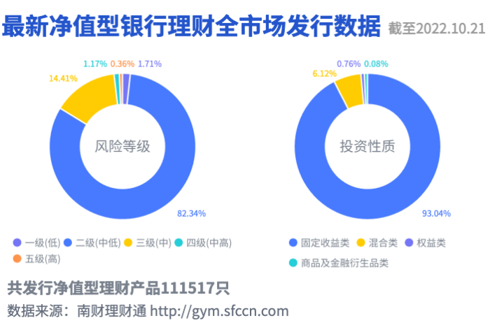 南财金融终端、南财理财通数据显示,截至2022年10月21日,全市场共发行净值型理财产品111,517只。其中,一级(低风险)产品占比1.71%,二级(中低风险)产品占比82.34%,三级(中风险)产品占比14.41%,四级(中高风险)产品占比1.17%,五级(高风险)产品占比0.36%。