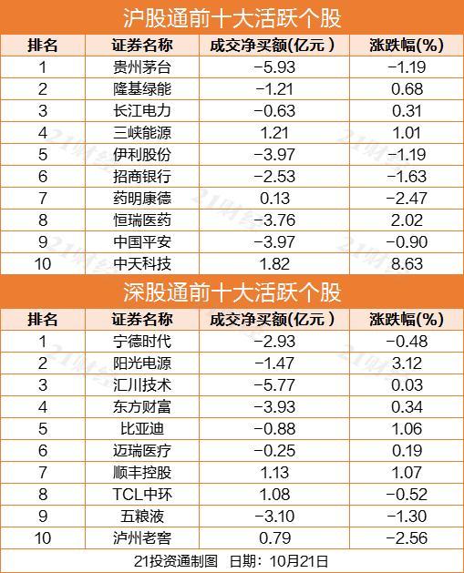 十大活跃个股方面,中天科技(600522.SH)、三峡能源(600905.SH)、顺丰控股(002352.SZ)获净买入居前,金额分别为1.82亿元、1.21亿元、1.13亿元。