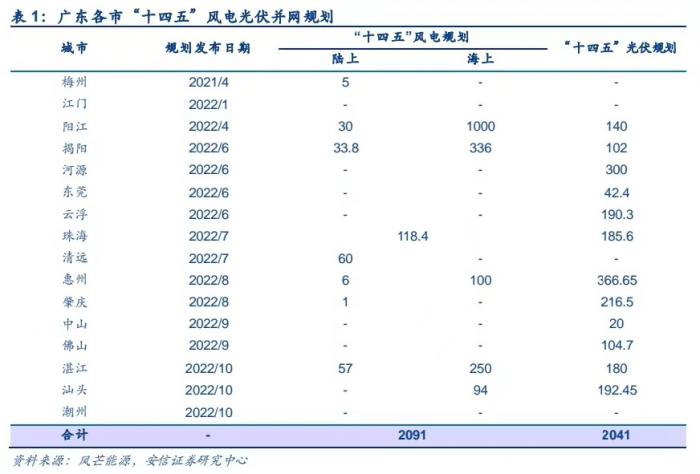 安信证券认为,根据《广东省能源发展“十四五”规划》,“十四五”期间广东规划新增海上风电装机容量约 17GW。据风芒能源的统计,目前广东共有16个市发布了“十四五”能源发展规划,其中规划的风电新增装机容量达到20.9GW(仅统计提出明确量化目标的城市),已超出全省规划目标。若考虑到本周潮州提出的43GW海上风电场址以及9月底汕头提出的谋划推动60GW海上风电资源开发等长期规划,“十四五”期间广东海上风电装机有望大超预期。