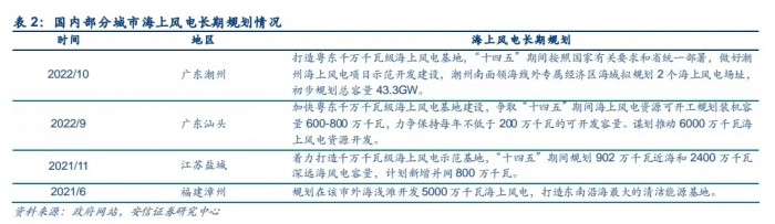 安信证券认为,国内海风远期装机空间持续打开,实际装机空间或将远超预期。目前国内所有沿海省份均设立了“十四五”期间海上风电装机目标,各省规划新增并网装机规模合计超过55GW。而从近期广东潮州、汕头以及此前江苏盐城、福建漳州等地的中长期规划目标来看,海上风力资源发达地区市级的规划就可达到数十GW的量级,因此未来国内海上风电实际装机空间或将远超预期。