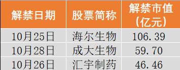 ➤沪深两市共有50家公司限售股陆续解禁,合计解禁量32.55亿股,解禁市值为605.29亿元(以10月21日收盘价计算)。解禁市值排名前三的个股分别为: