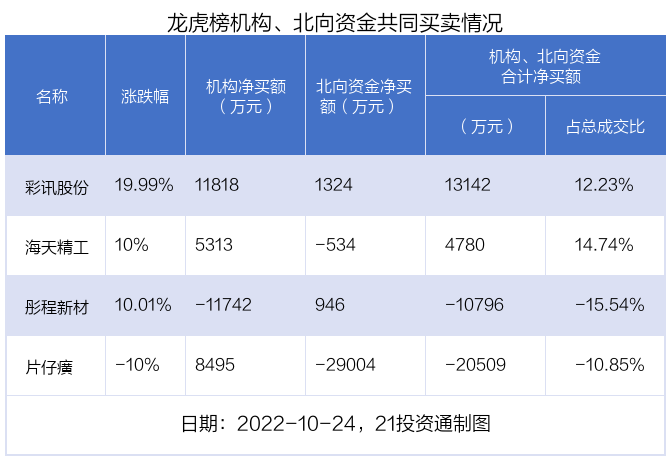 值得注意的是,机构和北向资金共同净买入彩讯股份;在彤程新材、海天精工、片仔癀上出现分歧,机构净卖出彤程新材1.17亿元,北向资金净买入945.72万元;机构净买入海天精工5313.34万元,北向资金净卖出533.76万元;机构净买入片仔癀8494.95万元,北向资金净卖出2.9亿元。