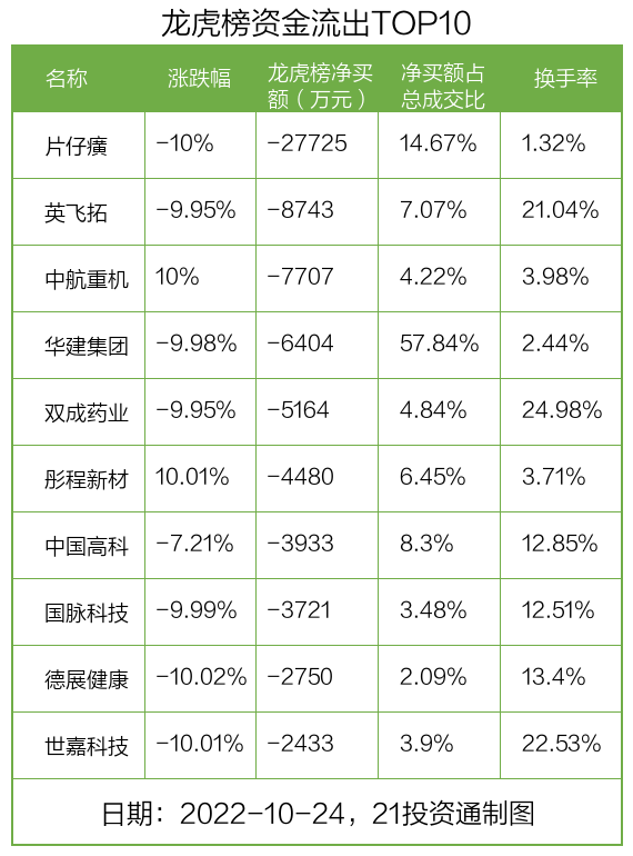 而龙虎榜中资金净流出最多的是片仔癀(600436.SH),被净卖出为2.77亿元,占总成交金额的14.67%。片仔癀收盘下跌10%,换手率为1.32%。