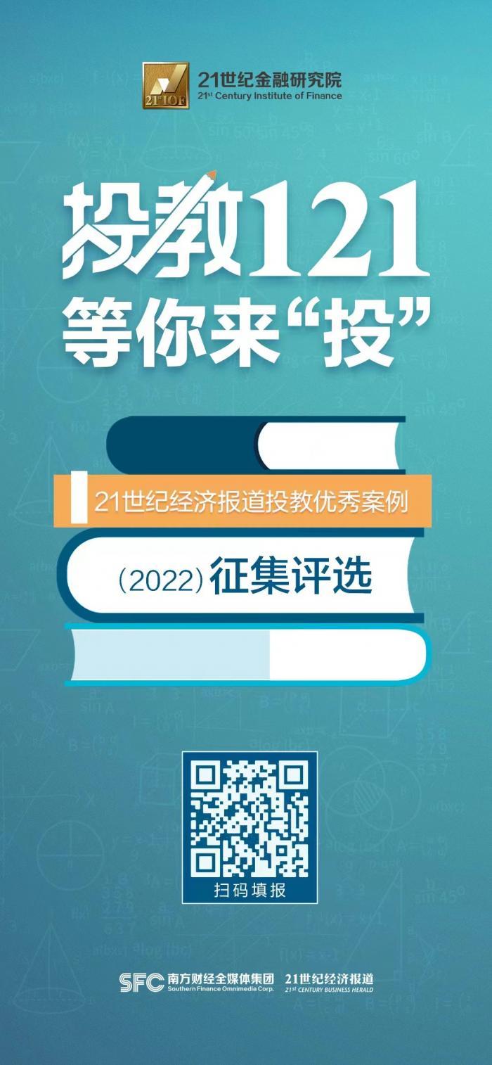 为发掘投教领域的种子选手,响应监管部门对投资者教育工作的新期待、新要求,进一步展现大资管时代金融机构的熠熠风采与投资者的智慧结晶,21世纪经济报道以及旗下21世纪金融研究院联合《投教121》栏目发起本年度的“金融投教优秀案例(2022)征集评选”活动,欢迎社会各界踊跃参与!
