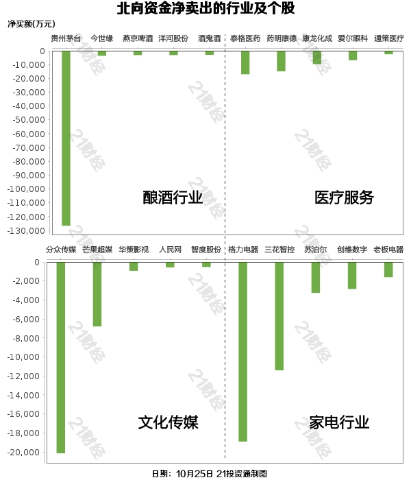北向资金减持了36个行业,其中酿酒行业最多,净卖出金额达7.80亿元,其次是医疗服务行业,净卖出3.56亿元。