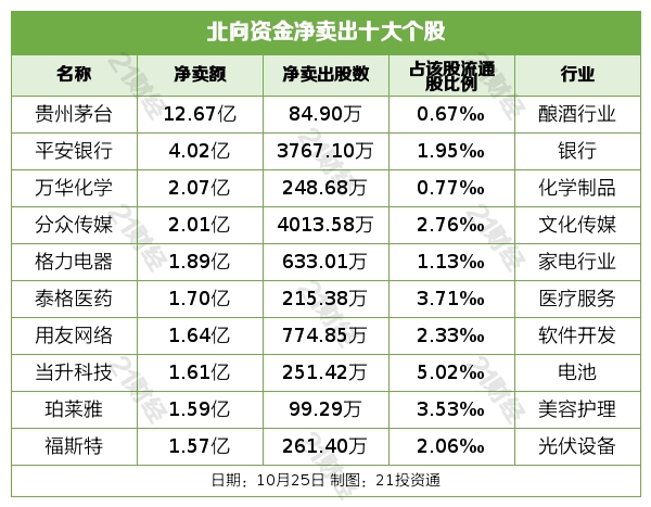 北向资金净卖出贵州茅台(600519.SH)、平安银行(000001.SZ)、万华化学(600309.SH)、分众传媒(002027.SZ)、格力电器(000651.SZ)居前,其中,贵州茅台被净卖出12.67亿元,平安银行被净卖出4.02亿元,万华化学被净卖出2.07亿元,分众传媒被净卖出2.01亿元,格力电器被净卖出1.89亿元。